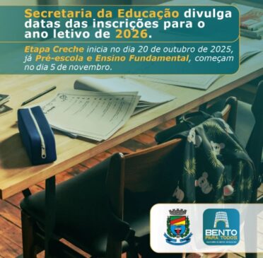 A Secretaria de Educação de Bento vem informar o período de inscrições para o ano letivo de 2026. A Etapa Creche inicia no dia 20 de outubro de 2025, com a abertura do sistema às 07h30, e se encerra no dia a 31 de outubro de 2025, encerrando às 23 horas, 59 minutos e 59 segundos.